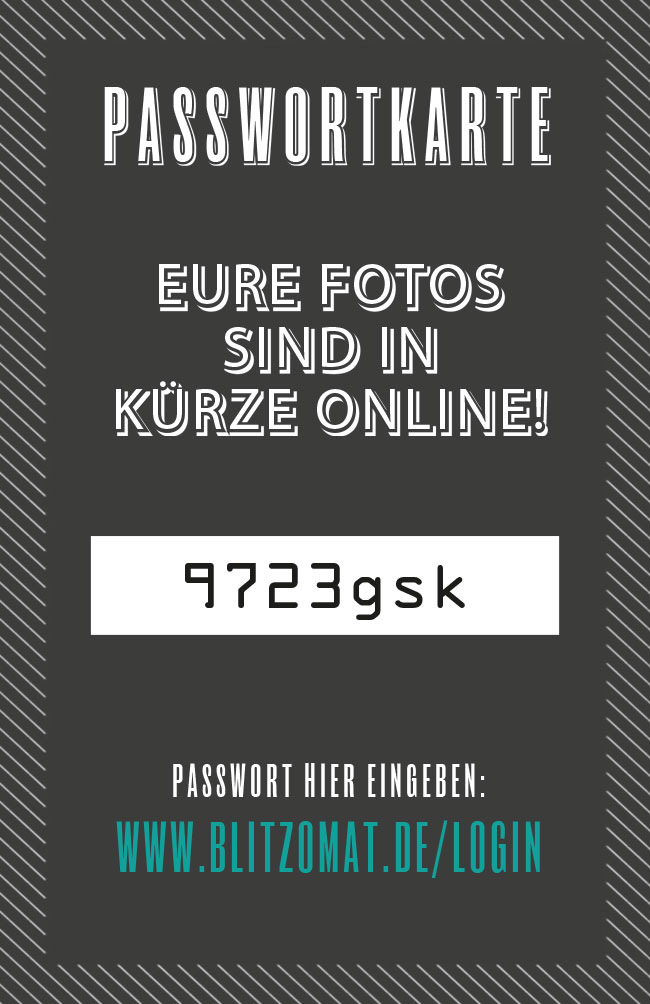 Du bekommst von uns schon vor der Veranstaltung 100 Passwortkarten mit dem Zugang zu deiner späteren Onlinegalerie. Diese kannst du dann schon auf der Feier an deine Gäste verteilen. Bitte beachte, dass Sonderzeichen nicht gedruckt werden können und deine Passwortkarten spätestens 10 Tage vor deiner Veranstaltung in den Druck gehen müssen.